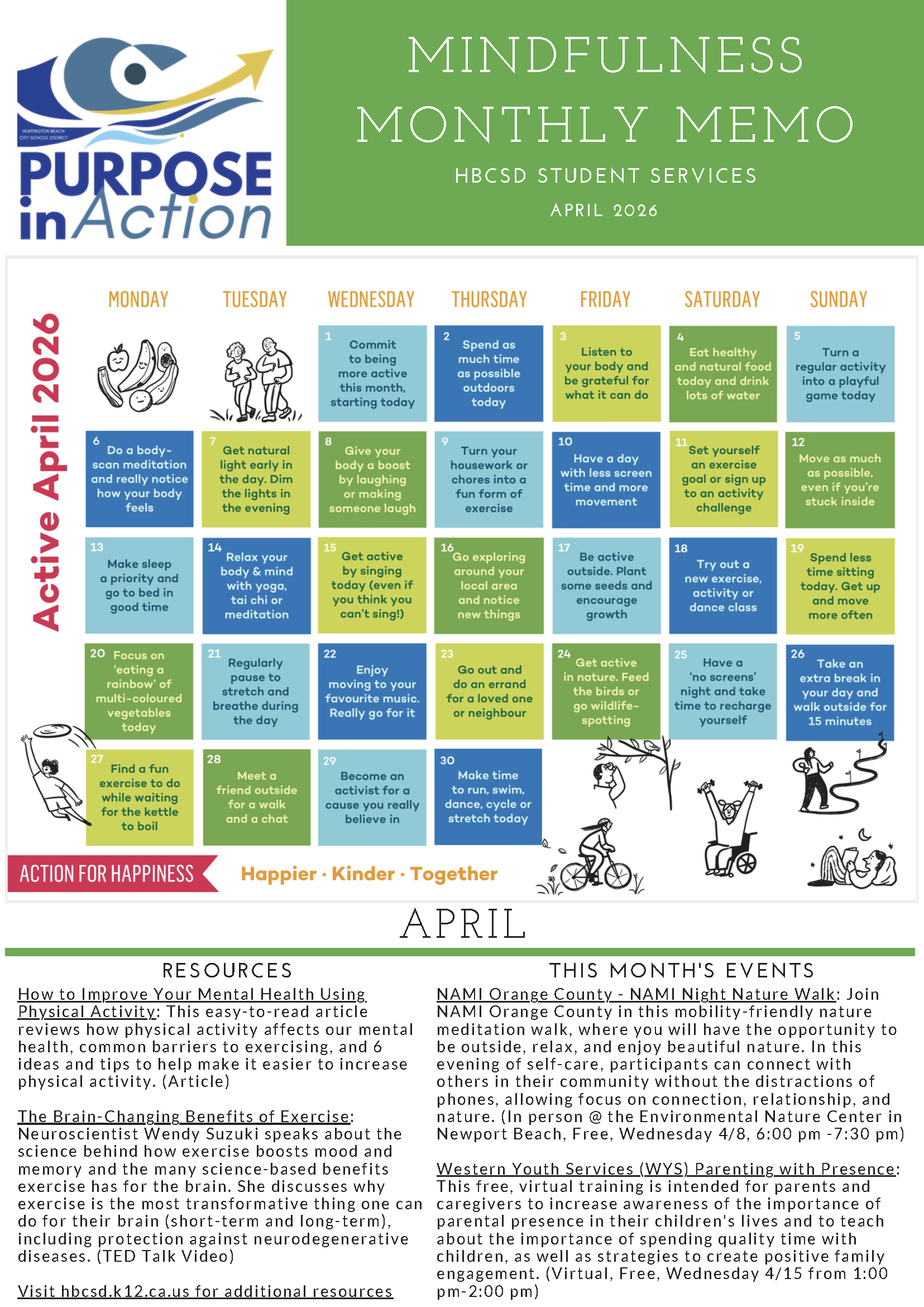 The theme of this month’s Mindfulness Monthly Memo is “Active April.” Many people know the benefits of exercise for the body, but did you know exercise also has tremendous benefits for the brain and mental health? According to research, moving your body and incorporating some sort of physical activity into your daily routine improves one's sense of well-being and relieves stress. Exercise and physical activity also have mental health benefits in children, with research suggesting that children should engage in at least 30 minutes of moderate exercise each day.